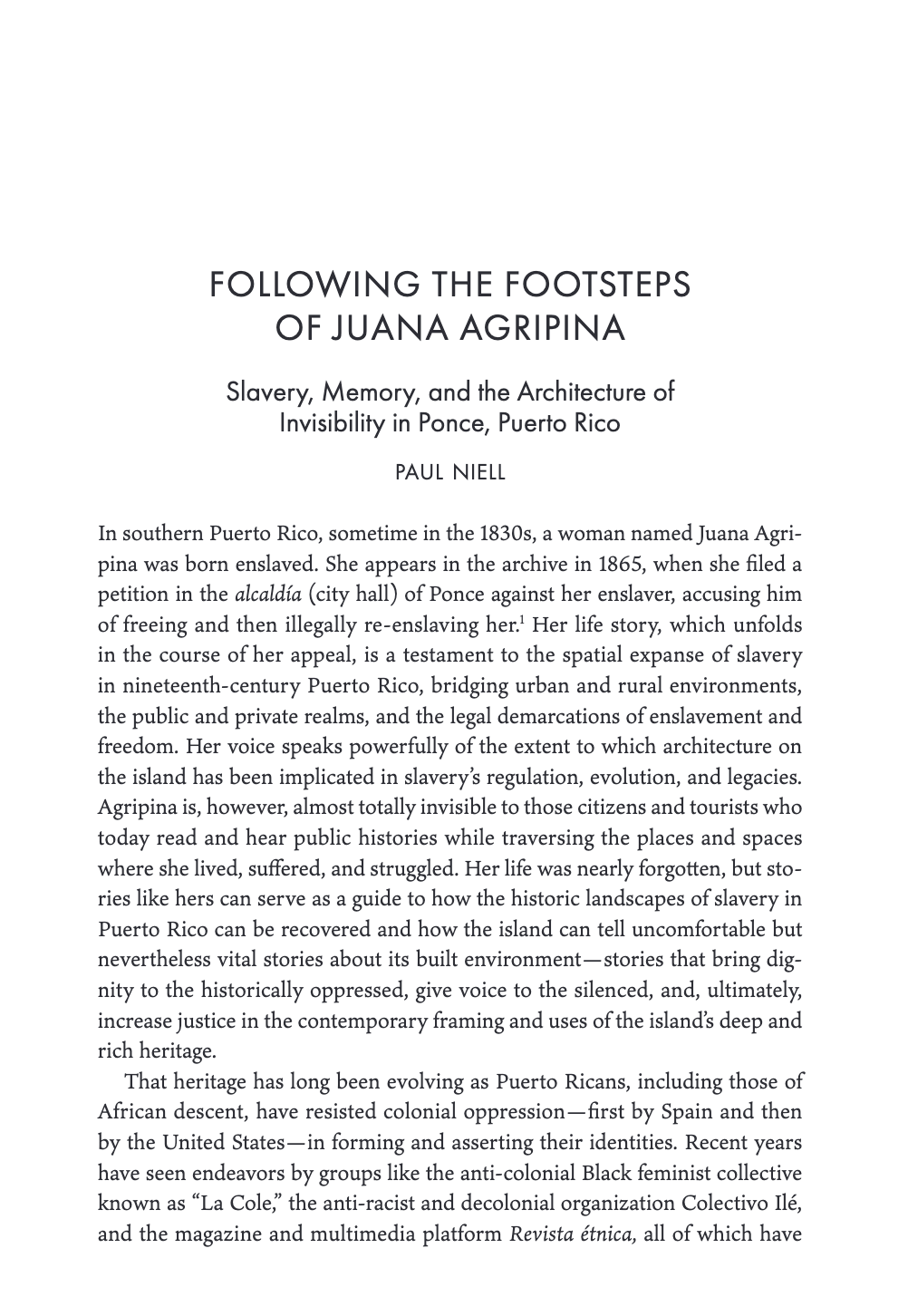 Paul Niell, “Following the Footsteps of Juana Agripina: Slavery, Memory, and the Architecture of Invisibility in Ponce, Puerto Rico,” in Architectures of Slavery: Ruins and Reconstructions, edited by Nathaniel Robert Walker and Rachel Ama Asaa Engmann (Charlottesville: The University of Virginia Press, 2025), 94–115