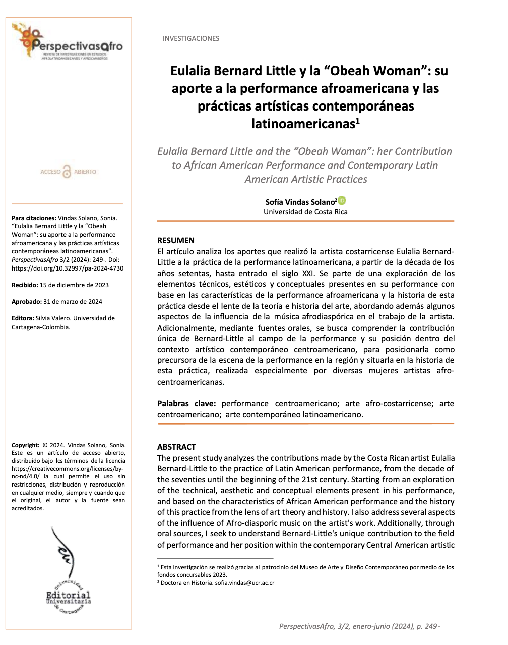 Sofia Vindas Solano, “Eulalia Bernard Little y La ‘Obeah Woman’: Su aporte a la performance Afroamericana y las prácticas artísticas contemporáneas Latinoamericanas,” Perspectivas Afroamericanas: Revista de Estudios Afrolatinoamericanos y Afrocaribeños 3, no. 2 (2024): 250–273